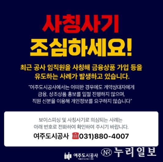 여주도시공사는 앞으로도 관련 피해 신고 채널 안내, 사칭 사례 대외 공지, 협력업체 맞춤형 예방 교육 등 사전 대응 활동을 지속할 계획이다.