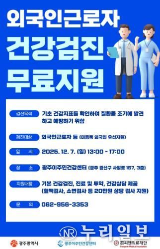 (누리일보) 광주광역시는 오는 7일 오후 1시부터 5시까지 광주이주민건강센터에서 외국인근로자 등을 대상으로 무료 건강검진을 실시한다.