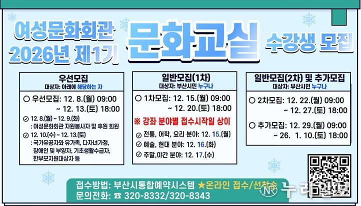 (누리일보) 부산시 여성문화회관은 오는 내일(8일)부터 '2026년 제1기 문화교실' 수강생을 모집한다고 밝혔다.