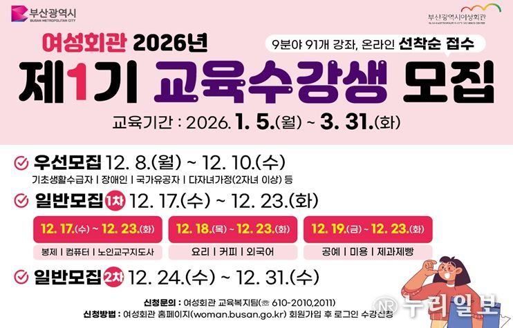 (누리일보) 부산시 여성회관은 내일(8일)부터 '2026년 제1기 교육과정' 수강생을 모집한다고 밝혔다.