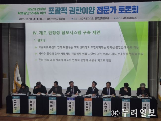 (누리일보) 제주특별자치도가 포괄적 권한이양 제도의 실효성과 안정성 확보를 위해 전문가 토론회를 개최한 가운데, 전문가들은 제도의 법적 타당성을 확인하며 공청회 의무화·규제심사 강화 등 안정적 운영 방안을 구체화했다.