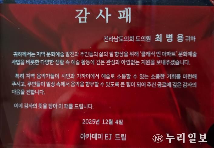 (누리일보) 전라남도의회 최병용 의원(여수5, 더불어민주당)이 지역 문화예술 발전과 주민 삶의 질 향상에 기여한 공로를 인정받아 지난 4일 지역 예술교육 기관인 ‘아카데미 EJ(대표 이은주)’로부터 감사패를 수상했다.