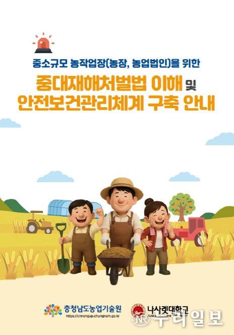 (누리일보) 충남도 농업기술원은 농업 분야 특성을 반영한 ‘중대재해처벌법 이해 및 안전보건관리체계 구축 안내서’를 제작해 농업현장에 보급했다고 17일 밝혔다.