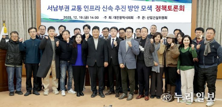 (누리일보) 대전시의회 산업건설위원회는 방진영 의원(더불어민주당, 유성구2)을 좌장으로 19일 대전시의회 소통실에서 '서남부권 교통 인프라 신속 추진 방안 모색 정책토론회'를 개최했다.