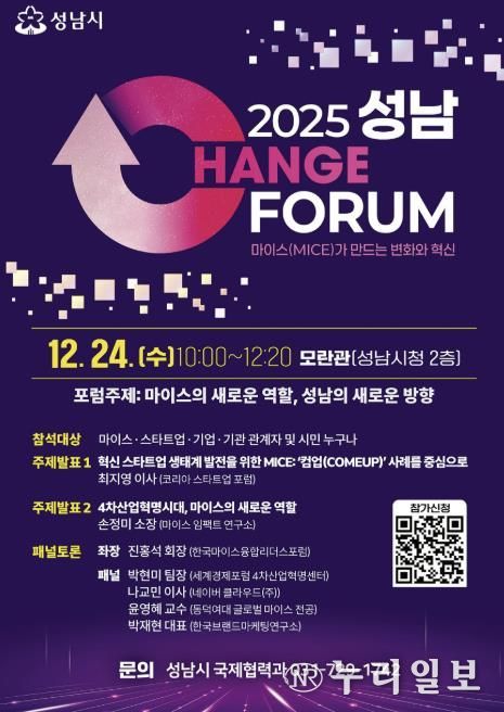 (누리일보) 성남시는 오는 12월 24일 오전 10시 성남시청 모란관에서 ‘2025 성남 체인지 포럼(CHANGE Forum)’을 개최한다.