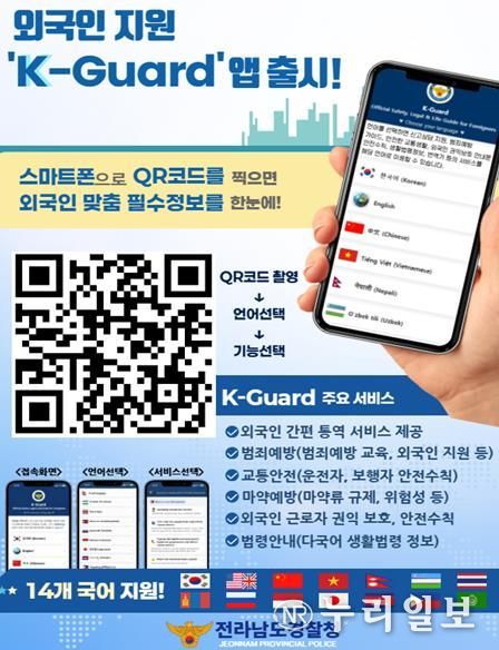(누리일보) 전남경찰청은 국내 체류 외국인의 범죄·사고 예방과 인권이 존중받는 사회를 위해 외국인 맞춤형 통합 정보제공 앱『K-Guard』를 개발하고, 12월 22일부터 시범운영에 들어간다고 밝혔다.