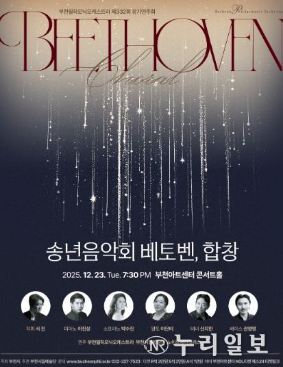 (누리일보) 부천필하모닉오케스트라가 오는 12월 23일 오후 7시 30분 부천아트센터 콘서트홀에서 제332회 정기연주회 송년음악회 ‘베토벤, 합창’을 개최한다. 이번 송년음악회는 부천필이 2015년부터 매년 선보여온 프로그램인 베토벤 '교향곡 제9번 ‘합창’'과 함께, 모차르트 '피아노 협주곡 제12번'이 연주된다. 공연에는 지휘자 서진과 부천필이 무대에 오르며, 소프라노 박수진, 메조소프라노 이단비, 테너 신지한, 베이스 권영명이 협연하며 부천시립합창단과 노이오페라코러스가 연주로 함께 무대를 꾸민다.