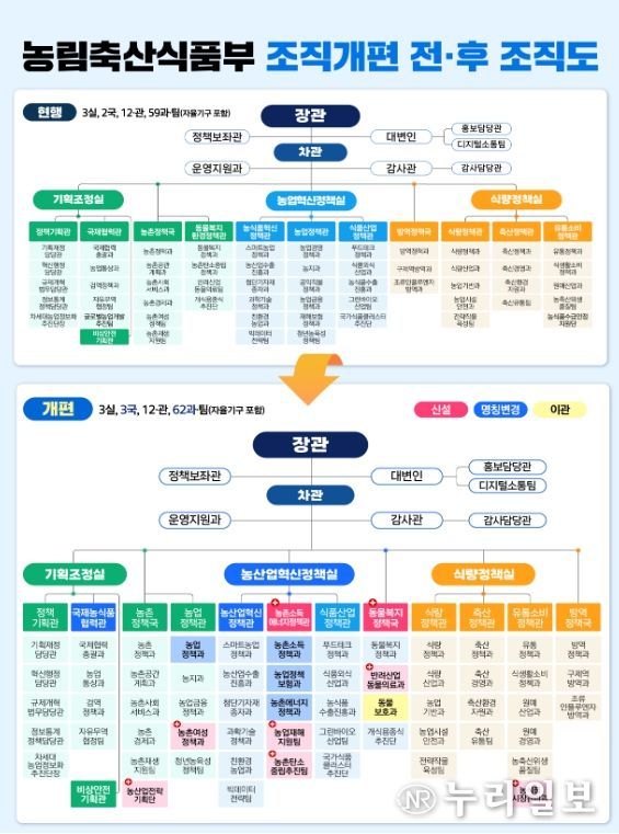 (누리일보) 농림축산식품부는 농정을 혁신하고 국민주권정부의 농정 비전인 ‘국민과 함께하는 농업, 희망을 실현하는 농촌’ 조기 구현을 뒷받침하기 위해 조직을 확대․개편한다.