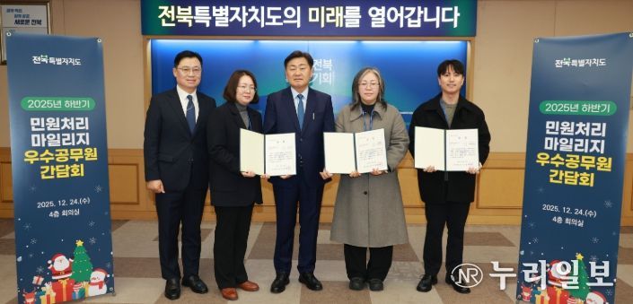 (누리일보) 전북특별자치도가 24일 '2025년 하반기 민원 처리 우수직원 시상 및 간담회'를 개최하고, 신속하고 성실한 민원 업무 수행으로 높은 평가를 받은 직원들을 격려했다.
