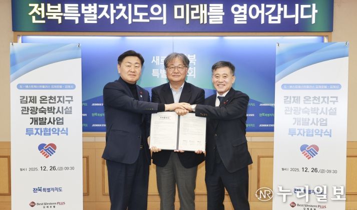 (누리일보) 전북특별자치도가 26일 도청 회의실에서 김제시, 베스트웨스턴플러스 김제호텔과 김제 온천지구 관광숙박시설 개발사업 투자협약(MOU)을 체결했다.