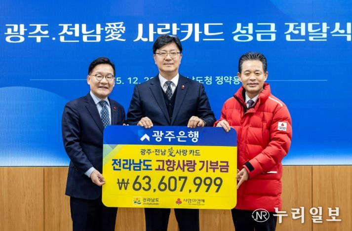 (누리일보) 광주은행은 26일 전남도청에서 열린 ‘광주·전남愛사랑카드 고향사랑 기부금 전달식’에 참석해 전남지역 복지사각지대 해소를 위한 고향사랑기부금 6,360만 원을 전달했다고 밝혔다.
