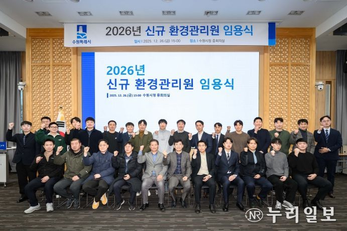 (누리일보) 수원특례시가 26일 시청 중회의실에서 2026년 신규 환경관리원 임용식을 열고, 신규 임용자 21명에게 임용장을 수여했다.