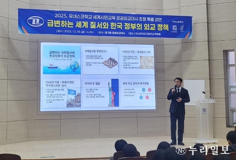 (누리일보) 전남교육 꿈실현재단은 26일 전남외국어고등학교에서 정기홍 외교부 공공외교대사를 초청, ‘급변하는 국제질서와 한국 정부의 외교정책’을 주제로 특별 강연을 열었다.