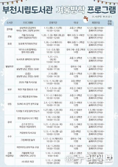 (누리일보) 부천시는 겨울방학을 맞아 내년 1월부터 2월까지 부천시립도서관에서 전 연령을 대상으로 독서문화 프로그램과 행사를 운영한다고 30일 밝혔다. 이번 프로그램은 연령과 관심사에 따라 다양한 참여 기회를 제공하기 위해 마련됐다.