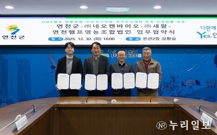 (누리일보) 연천군은 지난 30일 연천군청 본관 2층 상황실에서 ㈜네오켄바이오, ㈜새팜, 연천헴프영농조합법인과 함께 DMZ 지역 헴프(대마) 산업의 체계적 육성과 산업화를 위한 업무협약을 체결했다.