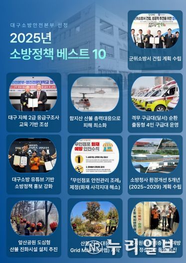 (누리일보) 대구소방안전본부는 2025년 한 해 동안 추진한 주요 소방정책 가운데 현장 대응력 강화와 시민 안전 증진에 기여한 ‘2025 대구소방 소방정책 베스트 10’을 선정해 발표했다.