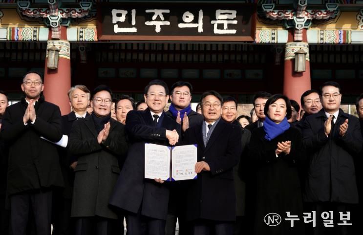 (누리일보) 병오년 새해, 광주시와 전남도가 대한민국 민주화의 상징인 국립5·18민주묘지 오월영령 앞에서 광주‧전남 대부흥의 새 역사를 열어가기 위한 행정통합을 즉각 추진하기로 공동 선언했다.