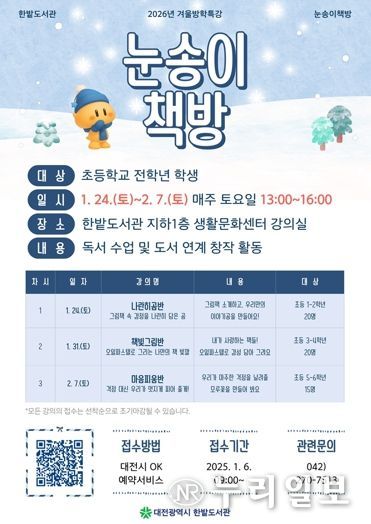 (누리일보) 대전 한밭도서관은 겨울방학을 맞아 어린이들의 독서 흥미 고취를 위해 겨울방학특강‘눈송이 책방’을 운영한다.