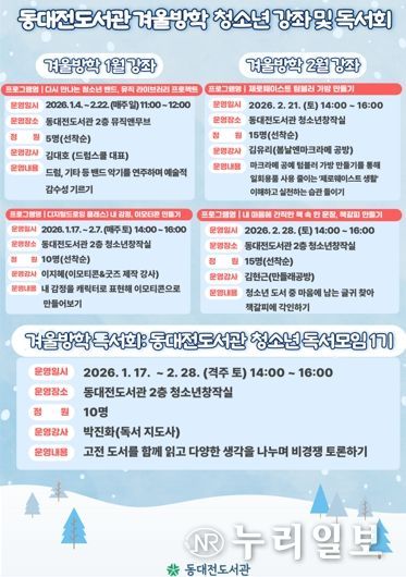 (누리일보) 동대전도서관은 겨울방학을 맞아 오는 1월 4일부터 2월 28일까지 청소년을 대상으로 독서회 및 창작 체험 강좌를 운영한다.