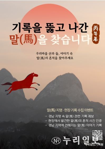 (누리일보) 경상남도기록원은 2026년 붉은 말(馬)의 해를 맞아 도민이 일상 속에서 발견한 말(馬) 관련 지명과 지역의 흔적, 개인의 기억을 기록으로 남기는 도민 참여형 기록 이벤트'기록을 뚫고 나간 말을 찾습니다'를 추진한다고 밝혔다.