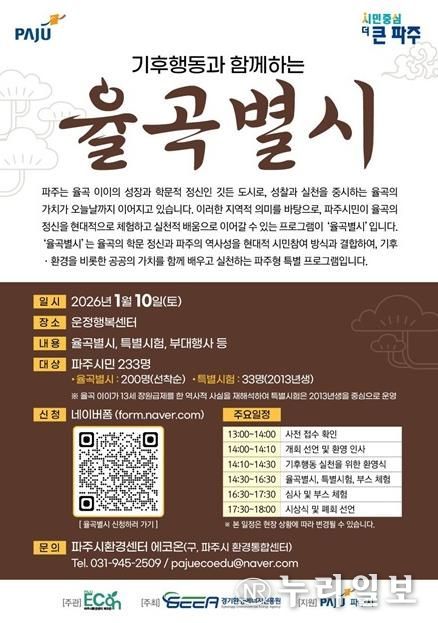 (누리일보) 파주시환경센터 에코온은 파주를 대표하는 조선시대 사상가 율곡 이이의 학문 정신을 현대적 기후행동 가치로 재해석한 기후문화축제 ‘기후행동과 함께하는 율곡별시’를 오는 10일 운정행복센터에서 개최한다고 밝혔다.