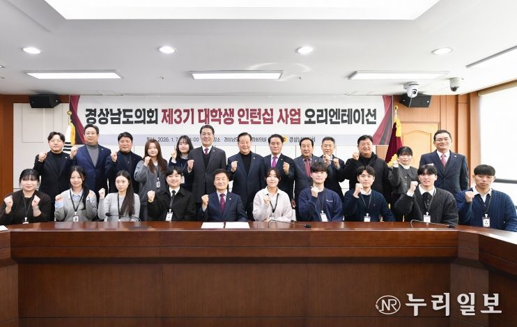 (누리일보) 경상남도의회가 7일, 제3기 대학생 인턴십 사업의 일환으로 의회·대학·인턴(학생) 간 3자협약을 체결하고 오리엔테이션을 개최하며 사업 운영에 본격 착수했다. 경남도의회 대학생 인턴십 사업은 도내 지역대학과의 교류·협력을 통해 의원들의 정책활동을 지원하는 한편, 대학생들에게는 지방의회 현장 체험과 진로 탐색의 기회를 제공하기 위해 추진되는 사업이다.