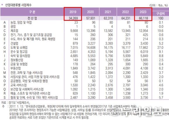 먼저, ▲기업체 분야를 살펴보면 2023년 기준 김포시 전체 사업체 수는 66,118개소로, 2019년 대비 31,849개소(92.9%↑)가 증가했다. 특히 에너지 산업(전기·가스 등) 분야의 성장세가 뚜렷했으며, 300~499명 규모의 중대형 사업체도 250% 늘어 지역 경제의 자족 기능이 강화되고 있는 것으로 분석된다.