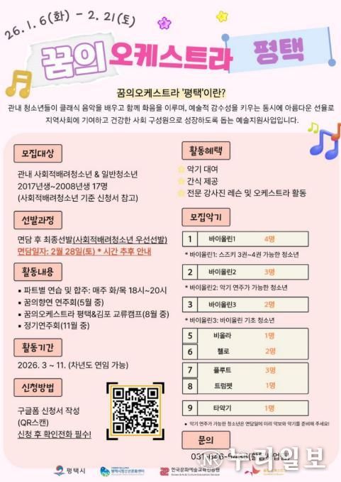 (누리일보) 평택시가 (재)평택시청소년재단에 위탁 운영하고 있는 평택시청소년문화센터는 관내 청소년을 대상으로 클래식 음악 교육을 통해 예술적 감수성과 협동심을 기르는 ‘꿈의 오케스트라 평택’2026년 신규단원을 모집한다고 밝혔다.