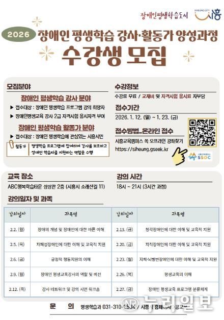 (누리일보) 시흥시는 오는 1월 23일까지 ‘2026년 장애인 평생학습 전문 강사와 활동가 양성 과정’ 수강생을 모집한다.