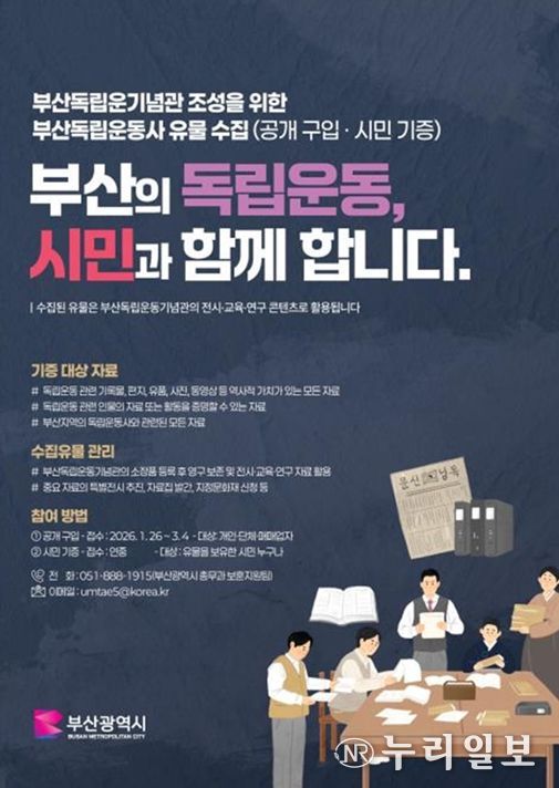 (누리일보) 부산시는 2027년 상반기 개관을 목표로 조성 중인 부산독립운동기념관의 전시·연구·교육 콘텐츠를 완성하기 위해, 부산 독립운동사 관련 유물 수집을 추진한다고 밝혔다.