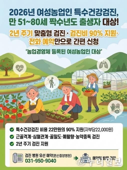 ‘여성농업인 특수건강검진 지원사업’은 농작업으로 인한 근골격계 질환과 만성질환을 조기에 예방하기 위해 여성농업인 맞춤형 건강검진을 2년 주기로 지원하는 사업으로 2025년도에는 251명이 검진을 지원받았으며, 2026년도에는 564명으로 지원 규모가 확대된다.