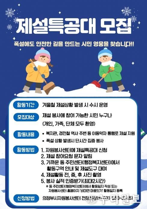(누리일보) 의정부시는 겨울철 폭설로 인한 시민 불편을 최소화하고 안전한 보행환경을 조성하기 위해 ‘제설특공대’를 모집한다.