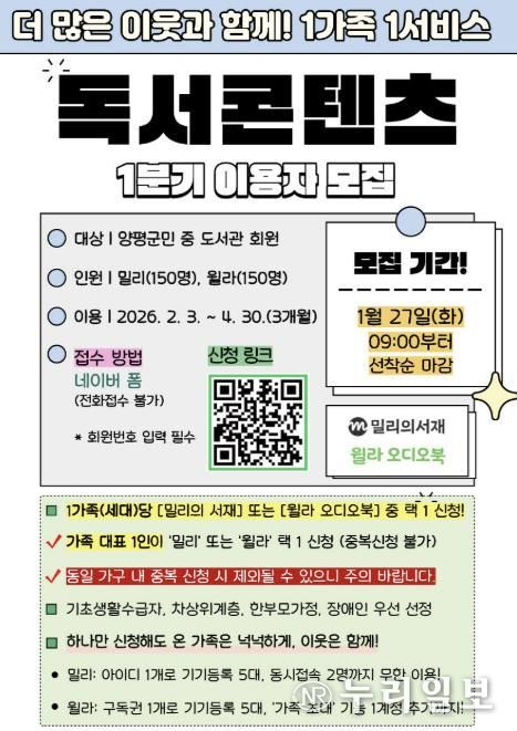 (누리일보) 양평군은 오는 27일부터 군민들이 시간과 장소에 구애받지 않고 독서를 즐길 수 있도록 ‘2026년 온라인 구독형 독서 콘텐츠 이용 지원 사업’을 시작한다고 밝혔다.