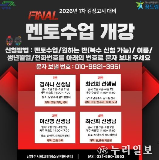 (누리일보) 남양주시는 오는 2월 3일부터 남양주시학교밖청소년지원센터에서 학업을 중단한 청소년을 대상으로 ‘2026년도 제1회 검정고시 대비 학습 멘토링 프로그램’을 운영한다고 밝혔다.