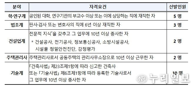 하자심사·분쟁조정위원회 제9기 위원 모집은 학·연구계, 법조계, 건설업계, 주택관리사, 기술계(건축사, 기술사) 5개 분야별 전문가를 대상으로 한다.