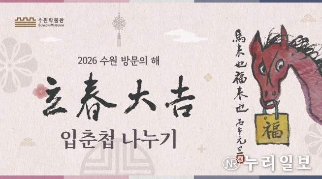 (누리일보) 수원박물관이 2026 수원 방문의 해를 맞아 1월 31일 오후 1시부터 3시까지 박물관 1층 로비에서 세시(歲時) 행사 ‘입춘첩 나누기’를 연다. 관람객에게 서예가 근당 양택동 선생의 친필 입춘첩을 배부한다.