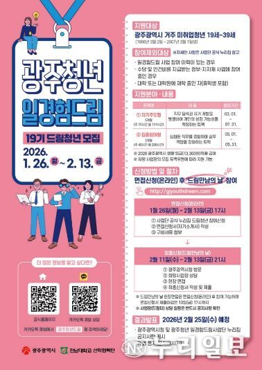 (누리일보) 광주광역시는 올해 상반기 ‘광주청년 일경험드림’에 참여할 제19기 드림청년 450명을 1월26일부터 2월13일까지 모집한다.