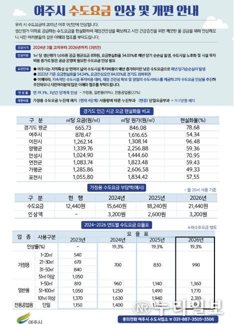 (누리일보) 여주시 수도사업소는 지난 2024년부터 추진해 온 ‘수도요금 현실화 3개년 계획’에 따라, 오는 2026년 3월 고지분부터 마무리 단계인 19.3% 인상을 시행한다고 밝혔다. 이번 인상은 만성적인 적자 구조를 탈피하고 시민들에게 보다 안전하고 깨끗한 수돗물을 공급하기 위한 조치다.