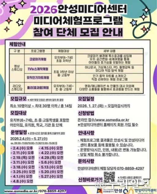 (누리일보) 안성미디어센터는 지역 어린이와 청소년이 미디어를 쉽고 재미있게 접할 수 있도록 ‘2026년 미디어체험프로그램’에 참여할 관내 어린이집, 유치원, 학교 등 단체를 모집한다고 밝혔다.
