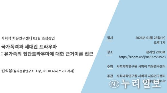 (누리일보) 경상국립대학교 사회과학연구원(원장 송원근 경제학부 교수)은 1월 28일 오후 7시 김석웅 심리건강연구소 소장을 초청해 ‘국가폭력과 세대 간 트라우마: 유가족의 집단트라우마에 대한 근거이론 접근’이라는 주제로 초청강연회를 개최한다.