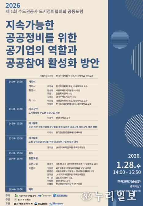 (누리일보) 경기주택도시공사(GH)는 1월 28일 서울 강남구 한국과학기술회관에서 서울주택도시개발공사(SH), 인천도시공사(iH)와 공동으로 ‘수도권 공사 도시정비협의회 공동포럼’을 개최한다고 27일 밝혔다.