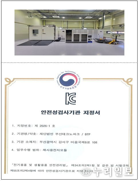 이번 자격 취득을 통해 (재)부산테크노파크는 'KC10031' 기준에 따른 사용후 배터리 안전성 검사를 공식 수행할 수 있게 됐다.