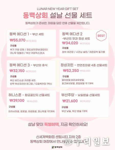 (누리일보) 부산시와 부산경제진흥원은 부산 우수 제품 쇼핑 숍 '동백상회'에서 설 명절을 앞두고 지역기업 제품으로 구성된 '선물 세트'를 출시하고, 동백상회 제품 구매 고객 대상 사은품 증정 행사를 진행한다고 밝혔다.