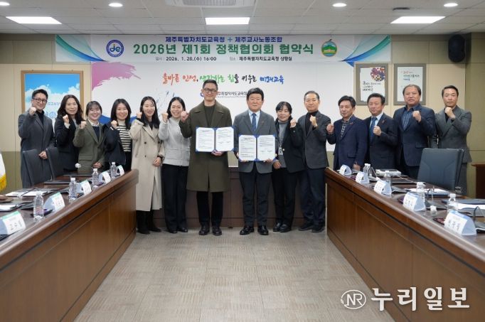 (누리일보) 제주특별자치도교육청과 제주교사노동조합은 학교 현장에서의 근무 여건 개선과 전문성 향상을 위한 6개 분야 정책과제에 대해 28일 도교육청 2층 상황실에서 정책협의회를 갖고 최종 합의했다.