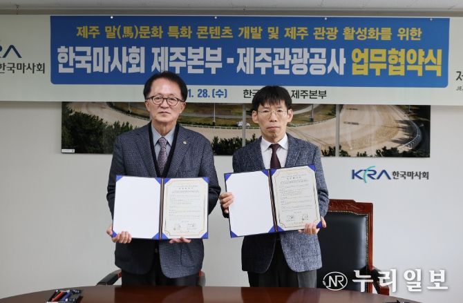 (누리일보) 제주관광공사(사장 고승철)는 지난 28일 렛츠런파크 제주에서 한국마사회 제주본부(본부장 유병돈)와 제주 말(馬) 문화 특화 콘텐츠 개발 및 제주관광 활성화를 위한 업무협약(MOU)을 체결했다고 29일 밝혔다.