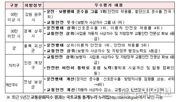 ’25년 교통문화지수 조사 결과, 강원 원주시(91.58점, 인구 30만 이상 시), 경북 상주시(87.62점, 인구 30만 미만 시), 충북 괴산군(88.72점, 군 지역), 인천 계양구(89.56점, 자치구)가 각각 1위로 선정됐다.