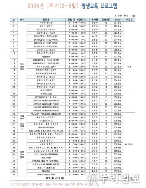 이번 학기에는 공모를 통해 선정된 46개 프로그램과 지역 우수강사의 재능을 활용한 12개 재능기부 프로그램 등 총 58개 강좌를 운영한다. 교육 과정은 영어 및 컴퓨터 등 기초문해 과정, 요리 및 동화구연지도사 등 직업능력·인문교양 과정, 통기타·민화·태극권 등 문화예술 과정으로 구성했다. 상반기 교육은 3월 3일부터 6월 29일까지 17주간 진행할 예정이다.