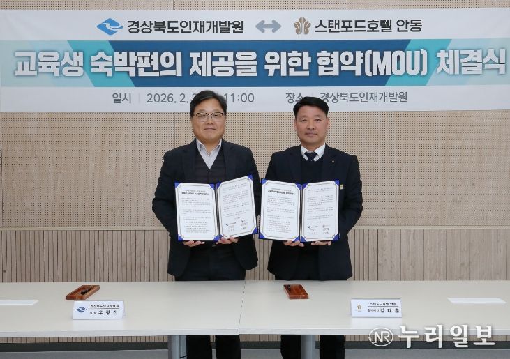 (누리일보) 경상북도인재개발원은 2.2. 인재개발원에서 ‘스텐포드호텔 안동’과 교육생 숙박 편의 제공 및 지역 관광 활성화를 위한 업무협약(MOU)을 체결했다.
