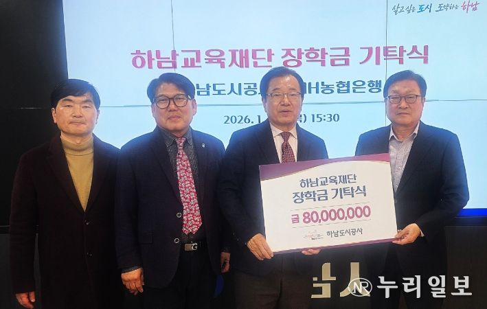 (누리일보) 하남교육재단은 29일 하남시청에서 하남도시공사로부터 하남시 미래인재육성을 위해 장학금과 캠퍼스투어 운영을 위한 기부금 8천만 원을 전달받았다.
