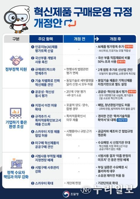 (누리일보) 조달청은 공공분야 혁신조달을 확대하여 우리 경제의 혁신 성장을 견인하기 위해 '혁신제품 구매 운영 규정'을 개정하여 2월 3일부터 시행한다.